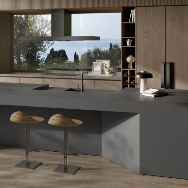 Grey Argo CMT è disponibile nelle tre finiture Gloss, Grain 2.0 e Rocplan 2.0, con lastre di 144 × 307 cm e spessori 1,2 cm o 2 cm Grazie alla sua tonalità grigia con venature calde e alla vena passante, questa variante è ideale per piani cucina, piani bagno, rivestimenti, pavimenti e complementi d’arredo.